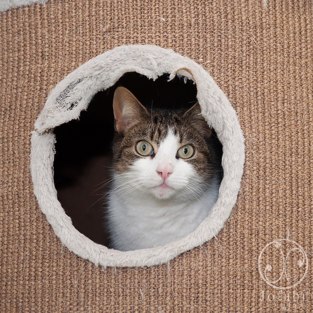 Tijgertje was helemaal een verrassing. Een paar weken heb ik haar in de krabpaal zien zitten. Vorige week wat dieper verstopt, nu kwam ze wat dichter bij de opening zitten. Ik ben bij haar gaan zitten in de veronderstelling dat dat het enige was dat ik van haar zou zien. Maar ze kwam zelfs helemaal uit haar veilige plek en wilde wat spelen.